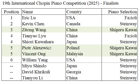 Yesterday marked the end of the final round and judging, and on October 21 (Japan time), the winners of the 19th International Chopin Piano Competition were announced. Congratulations to Mr. Eric Lu, who distinguished himself among an incredibly competitive field to take first place, and to all the contestants and piano technicians who poured everything into this remarkable journey. Everyone who reached the final round is already a world-class artist with extraordinary technique and individuality — I’m genuinely excited to see how their careers will continue to flourish from here.