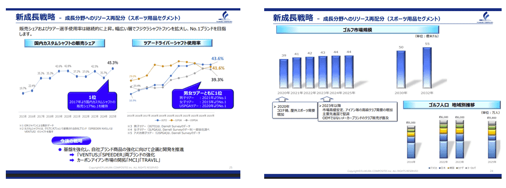 図1でお示ししている通り、今回の決算説明会資料では、ゴルフシャフト事業における当社のグローバルなシェアがとても分かりやすく示されており、国内カスタムシャフト販売シェアでは過去10年間で19.7%から45.3%、ツアードライバーシャフト利用率もアメリカの男子ツアーで23.4%から39.3%(日本男子ツアーでは16.9%→43.6%、日本女子ツアーでは29.0%→41.6%)まで、安定的かつ大幅に向上していることが確認できます。当社商品のブランドが長い期間をかけて着実に拡充されてきたことが一目でわかるようになった点は、IR面の素晴らしい改善と感じております。加えて、ゴルフ市場全体の市場規模の推移・将来見通しが示されたことで、今後5年間で市場全体としても緩やかな成長が見込める点が確認できた点に加えて、当社のアンダップドマーケットとなる領域での取り組みも質疑応答の中で、丁寧にお示しいただけた点は、これまでと比べたIR面での大幅な改善として感じています。